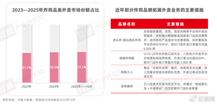 据红餐大数据,2023年以来,炸鸡品类的外卖市场份额占比一直超过50%,且有增长的趋势,2025年1—10月全国炸鸡门店的外卖市场份额占比达到了53.1%,较2023年提升了1.6个百分点。