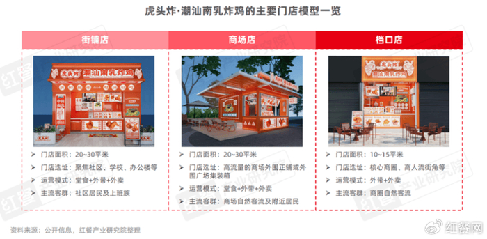 小店型意味着投资小,易复制,试错成本较低。比如虎头炸·潮汕南乳炸鸡,其在广东地区有近10种不同模式的店型,从商场店、外围集装箱店、街铺店到景区流量店、学校店到办公社区店,所有店型都是小型门店,灵活适配各类选址需求,单店最低投资门槛可降至12万元左右。