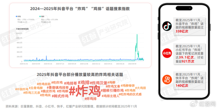 近年来,炸鸡相关话题在各大媒体平台上持续引发热议,热度居高不下。截至2025年11月,“炸鸡”话题在抖音平台和快手平台的视频播放量分别超过338亿次和140亿次,小红书平台上“炸鸡”话题下的笔记浏览量也达到了39.1亿次。