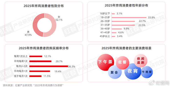 不过,据红餐产业研究院“2025年炸鸡消费行为调研”,炸鸡以18~35岁的年轻消费群体为主,占比为79%。其中,18~25岁的消费者占比为33.8%,其次是26~30岁和31~35岁的消费者,占比均超过了20%。