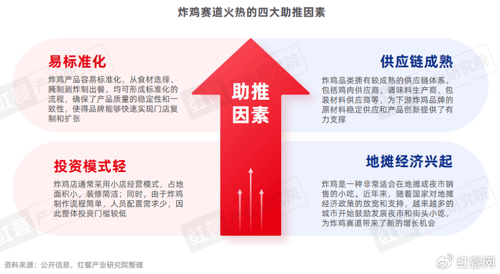 炸鸡赛道之所以能在竞争激烈的市场中持续火热,主要得益于以下四个关键助推因素:易标准化、供应链成熟、投资模式轻以及地摊经济的兴起。