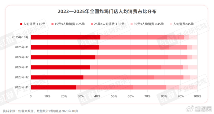 另外,在餐饮市场竞争日益激烈的背景下,炸鸡品类的人均消费也有所下滑。红餐大数据显示,截至2025年10月,全国炸鸡门店的人均消费已降至20元,较2023年年底的22.5元下降了11.1个百分点。
