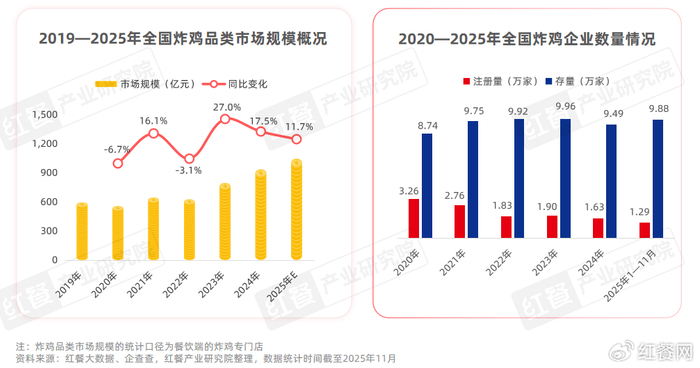 在这些助推因素下,炸鸡赛道近年出现了高速增长。红餐大数据显示,2019—2024年,全国炸鸡品类市场规模的年复合增长率达到9.4%。截至2025年11月,全国炸鸡门店已有16.4万家,预计2025年炸鸡品类市场规模同比增速将达到11.7%。