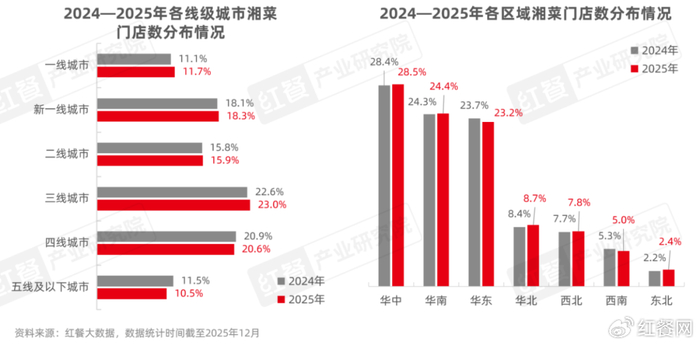 在门店分布方面,近两年湘菜门店在不同线级城市与区域的结构分布整体趋于稳定。具体来看,三线城市、四线城市的湘菜门店数占比均超过20%,其他线级城市的湘菜门店数占比均在10%以上。其中,一线城市、新一线城市、二线城市以及三线城市的湘菜门店数占比均有微弱上升。从区域上看,华中、华南与华东仍是湘菜门店最为集中的三大区域,门店数占比均超过20%。