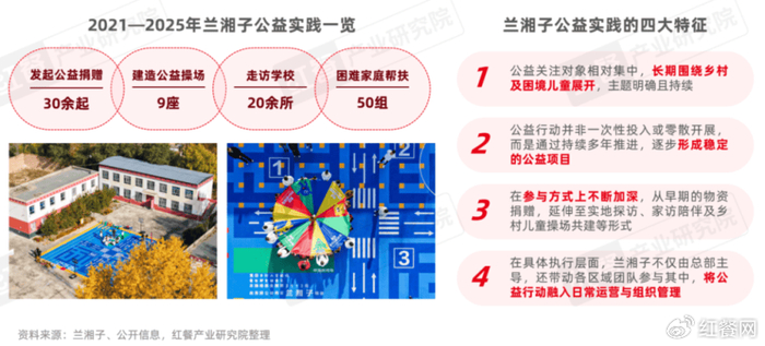 在此背景下,主动承担社会责任已成为餐饮品牌构建长期信任与情感价值的重要途径。在湘菜赛道中,兰湘子自2021年起,围绕乡村教育及儿童成长持续开展相关公益项目。一方面,兰湘子联合美团、壹基金推进乡村儿童操场公益项目,累计捐建9座操场;另一方面其通过自主对接学校、困难家庭及残障儿童机构,开展图书和运动器材等物资捐赠、入户家访及生活物资帮扶等公益活动。兰湘子积极将社会责任系统化地融入品牌经营发展战略中,使公益成为品牌价值的重要组成部分。