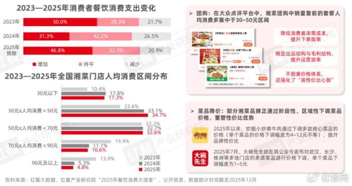 近年来,消费者的餐饮消费较为审慎。据红餐产业研究院调研,2024年餐饮消费支出增加的消费者占比较2023年大幅下降,对于2025年的餐饮支出预期,超过半数的消费者表示其2025年餐饮消费支出将有所下降或保持不变。在性价比需求持续增长的大背景下,团购、菜品降价等方式逐步成为部分湘菜品牌稳定客流、提升吸引力的重要手段。