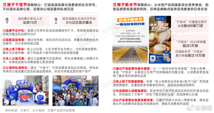 以兰湘子为例,其2023年打造了“干饭节”“新米节”活动,并逐步形成年度化、体系化的品牌节日IP,截至2025年已连续举办三届。2025年,兰湘子扩大了“干饭节”“新米节”等系列活动规模,并进一步优化活动玩法与策略,不仅有效拉近品牌与消费者的距离,强化品牌心智,还实现公域流量向私域流量转化,形成完整的营销闭环。