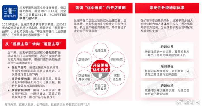 值得注意的是,随着“新质湘菜”理念逐步深化,众多湘菜品牌不再单纯追求门店数量的增长,转而更加关注经营质量与组织能力建设。以兰湘子为例,2025年其门店净增长超过60家,在扩张的同时,兰湘子对发展策略进行了调整,将重心从“规模主导”转向“运营主导”,通过强化产品力、提升出餐效率、优化就餐体验,提升门店长期经营的稳定性与可持续性。