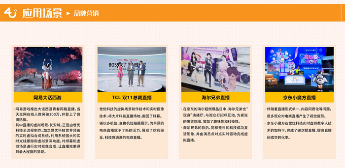 世优科技立足于实时虚拟数字人驱动技术和虚拟场景打造技术,结合专业化虚拟内容制作能力,针对写实高精度的专业级虚拟主播、虚拟形象、虚拟偶像的制作、渲染、驱动已经有一套全流程解决方案。截至目前,累计“复活”500+虚拟人IP,已服务品牌营销、汽车、电商零售、教育、媒体、政府、金融和大健康等领域千余品牌及合作伙伴。