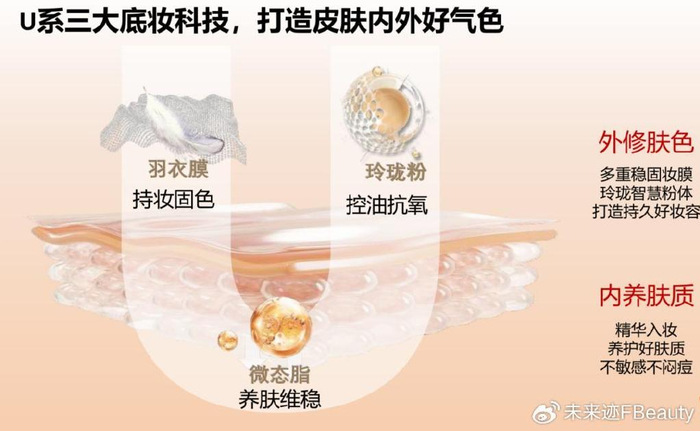 UNNY粉底液2.0版本中,创新应用到「专研U系持妆体系」,对消费者关注的底妆产品易脱妆、易暗沉、易闷痘等痛点问题进行了系统性攻克。