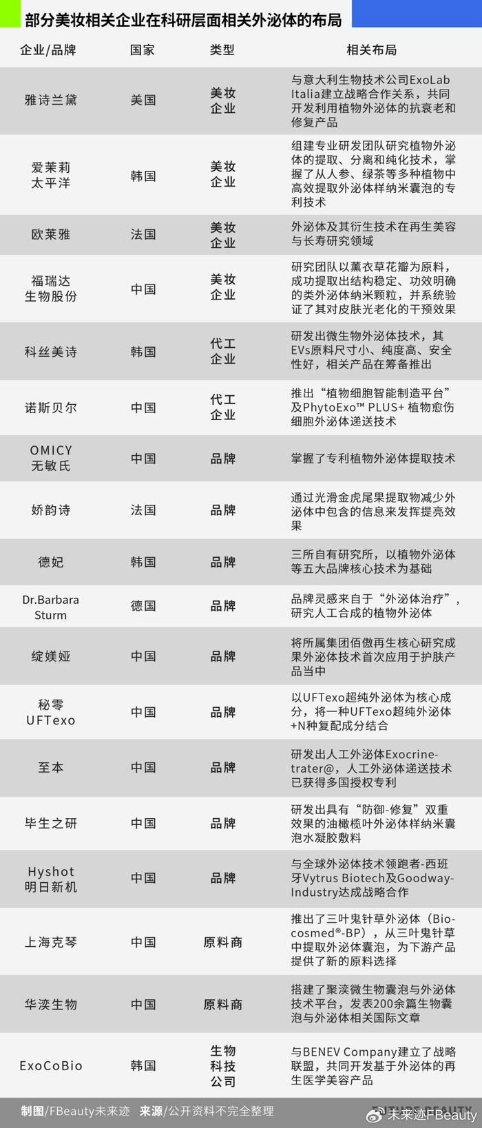 《FBeauty未来迹》整理发现,至少已有超17家美妆相关企业参与到外泌体的相关布局当中。其中包括雅诗兰黛、欧莱雅、爱茉莉太平洋等美妆巨头,以及科丝美诗、诺斯贝尔等头部代工企业,娇韵诗、绽媄娅等美妆品牌,以及上海克琴等原料商。
