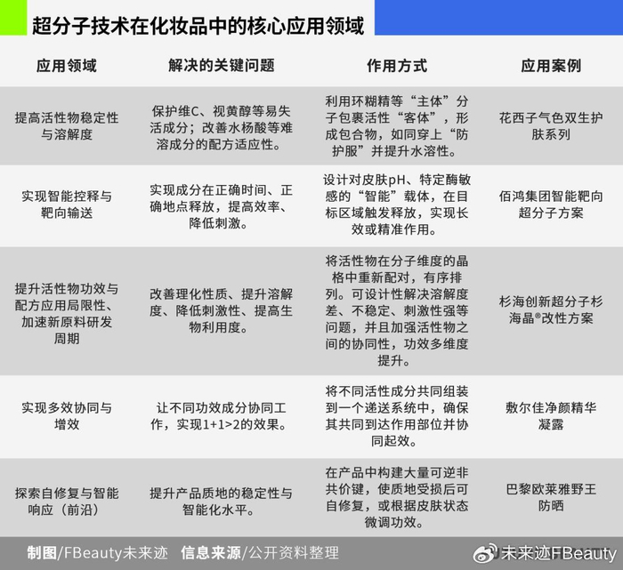 基础颜究创始人三亩在接受《FBeauty未来迹》采访时表示,“超分子技术的核心优势在于其‘广谱性’,能够根据不同目标实现促渗、缓释或稳定等多种功能”。这也意味着,超分子技术可以帮助一些“过气”的英雄功效成分实现焕新。