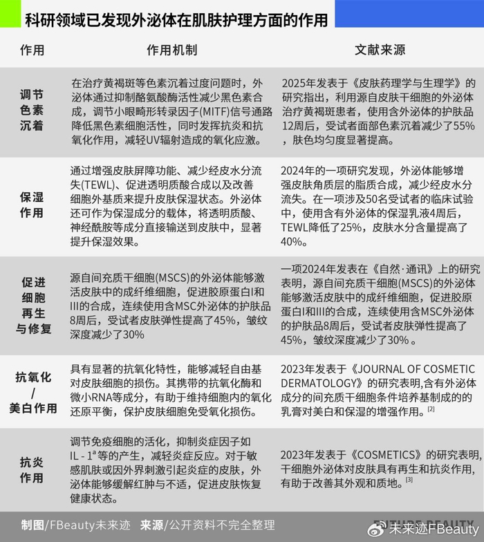 “外泌体目前正从实验室向产业化加速跃迁,未来有望成为美妆行业‘再生医学’转型的载体。”河南省科学院中原美谷产业技术研究院院长范航博士对《FBeauty未来迹》,表示“外泌体的核心优势在于与皮肤细胞的亲和性,在护肤产品驻留的有限时间内,能快速吸收起效。”