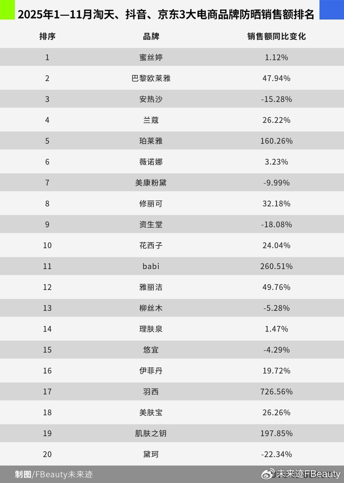 从品牌维度来看,2025年1—11月销售排名格局没有太大变化,蜜丝婷、巴黎欧莱雅、安热沙等品牌依旧在防晒品类中保持领先位置。与此同时,由于小金管、小银管等产品在该周期内的爆发增长,巴黎欧莱雅在防晒赛道领先并依旧保持47.94%的强势增长。