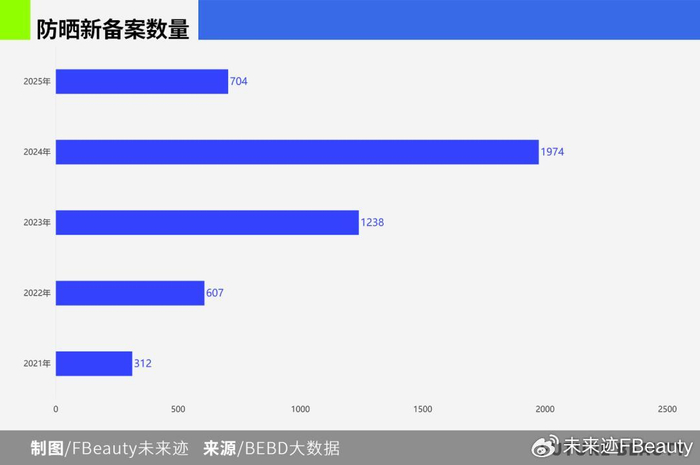 从产品备案数据来看,2021年至今,市场上防晒产品总备案数量4835个,当前有效备案数量为4516个,整个2025年防晒新增备案近704个(注:防晒产品特证备案有效期为5年,已有产品迭代可更新备案,不用重新注册)。这意味着,自2021年防晒特证管理以来,去年是市场上防晒产品最丰富的一年。
