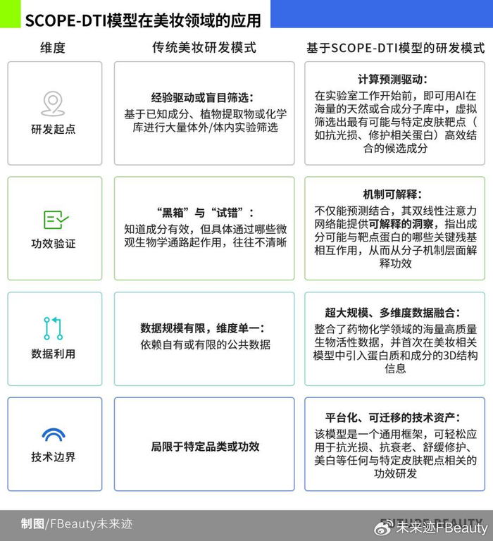 2025年末,MISTINE蜜丝婷SCOPE-DTI的人工智能大模型登上了国际顶级学术期刊《Nature Communications》。该模型基于13个国际权威数据库构建,通过模拟蛋白质与小分子的三维结构,并采用双线性注意力网络等先进算法,实现了对“成分-靶点”相互作用的高精度、高通量预测。让抗光损、舒缓修护等复杂功效的验证从“黑箱”走向“白盒”。