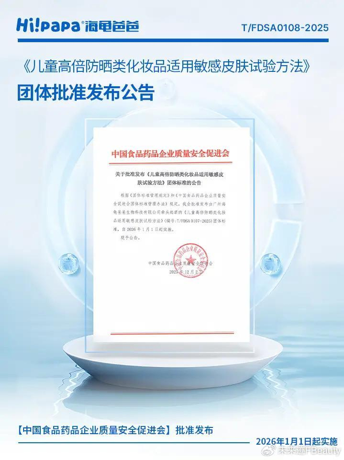 例如,2025年海龟爸爸牵头制定、发布国内首个“防晒清水可洗”团体标准和《儿童高倍防晒化妆品适用敏感皮肤试验方法》团体标准。其中,“防晒清水可洗”团体标准是中国首个聚焦于防晒产品使用清洗方法便捷性和安全性而制定的团体标准。