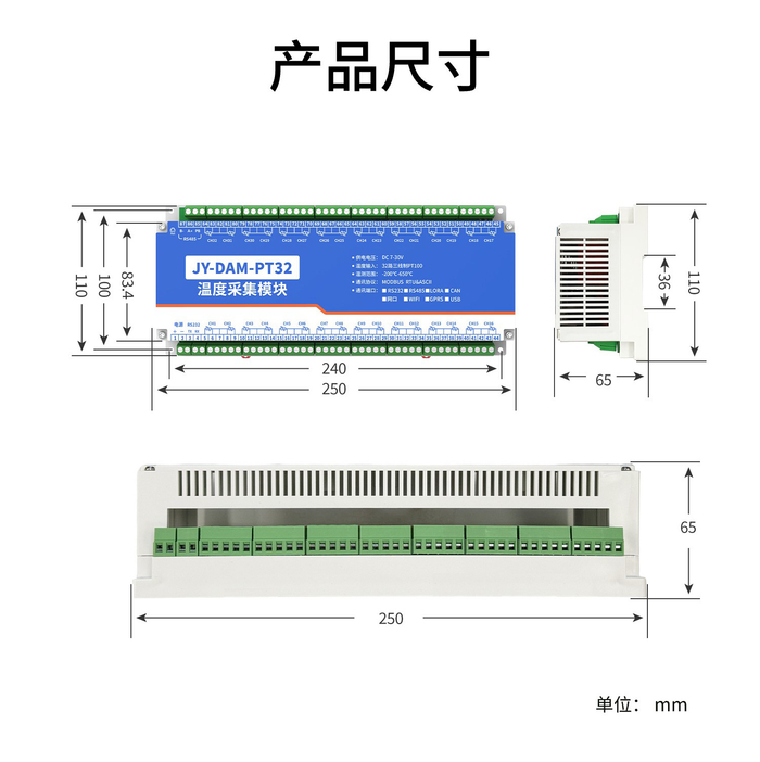 32路PT100热电阻温度采集变送器产品尺寸