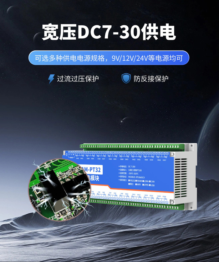 32路PT100热电阻温度采集变送器宽压供电