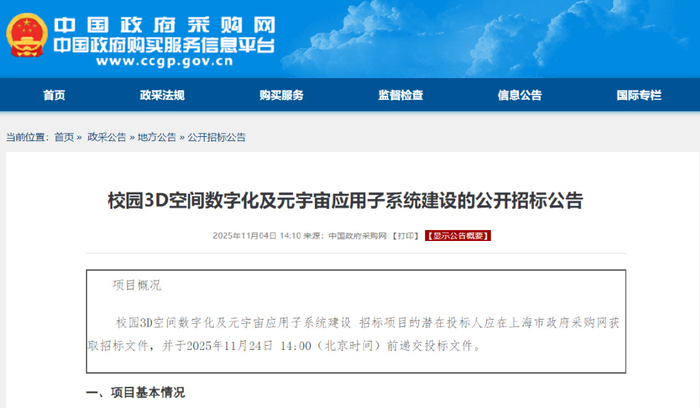 从公告内容来看,校园3D空间数字化及元宇宙应用子系统建设项目涵盖多个方面,包括校园3D空间数字化系统、“元宇宙+教育”平台系统以及开放式共建共享平台系统等。该项目设定了最高限价,为2353640元,投标截止日期是2025年11月24日。