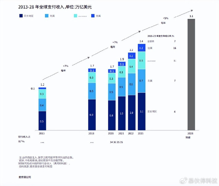 近期, 全球管理咨询公司麦肯锡公司发布的《麦肯锡2024年度全球支付行业发展报告》显示,预计2028年全球支付行业收入有望达到3.1万亿美元,未来五年的增速将保持在5%的稳健水平。