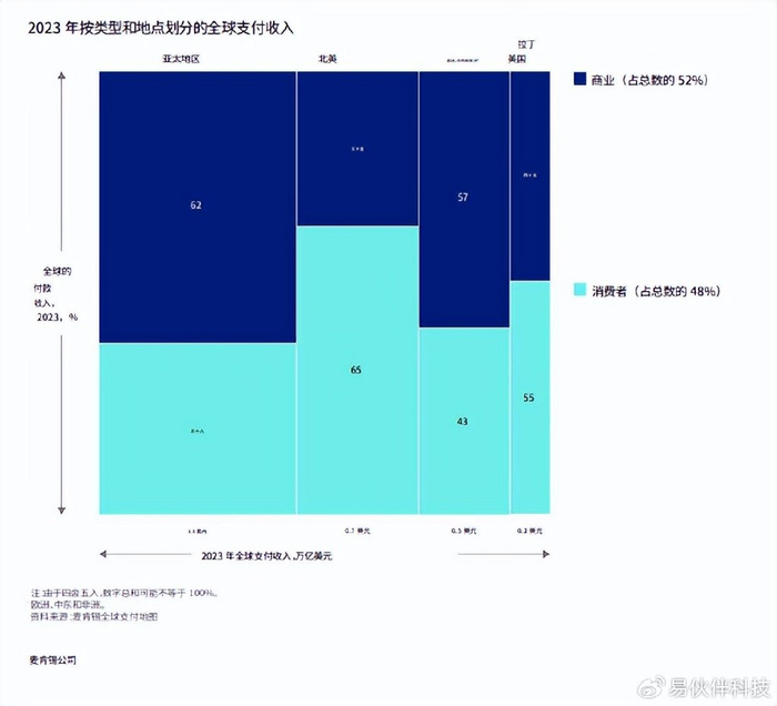 报告进一步细分支付场景,指出商业支付收入占总收入的52%,消费者支付占48%。数据不仅反映出企业在日常运营中对支付服务的高度依赖,也揭示了消费者支付需求的多样性和个性化趋势,将为支付行业带来新的增长动力。