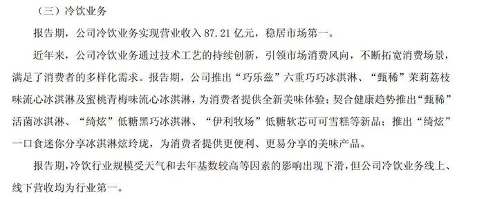 一般而言,消费者更倾向于在炎热夏季选购冷冻饮品,进入寒冷的秋冬季后,对这类产品的购买意愿会显著降低。比如,2024年财报显示,伊利冷饮业务营收87.21亿元,同比骤降18.4%,主要系“天气和去年基数较高等因素的影响”。