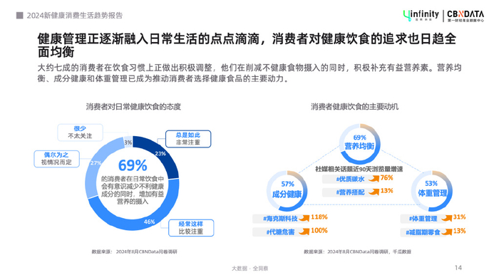 CBNData发布的《健康产业消费趋势发展报告》显示,2024年,69%的受访者在日常饮食中有意识减少不利健康成分的同时,增加有益营养的摄入。低门槛、轻负担、愉悦性等积极体验,已成健康消费的重要价值之一。
