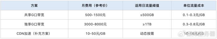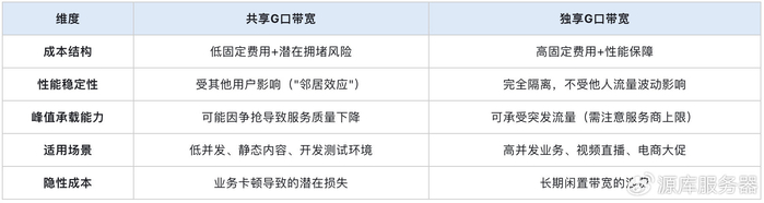 三、深度技术分析1.共享带宽的"资源争抢"机制多数服务商采用动态分配算法,按用户需求实时划分带宽。典型场景:若10个用户共享1G口带宽,某用户突发流量占300Mbps,其他用户可用带宽会临时下降。风险点:晚间高峰或遭受CC攻击时,可能出现全链路拥堵。2.独享带宽的"性能天花板"物理端口理论值≠实际可用带宽。例如:1G口独享带宽实际速率约900Mbps(考虑传输损耗)若服务商交换机架构落后,可能成为新瓶颈成本优化空间:部分云厂商支持"弹性独享",按使用时长计费。四、成本效益模型