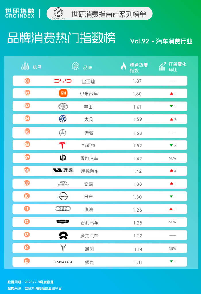 本次监测周期内,比亚迪、小米汽车和丰田分别以1.87、1.80和1.61的综合热度位列榜单前三名。