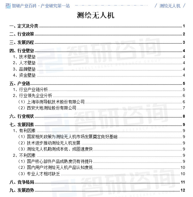 智研产业百科是智研咨询推出的产研工具平台,致力于为您提供全方位的百科式产业信息查询服务。智研咨询践行用信息驱动产业发展的企业使命,完善和丰富企业方法论,依托产业百科平台提升信息价值,持续为行业发展及企业投资决策赋能。测绘无人机产业百科作为测绘无人机产业一站式系统化研究工具,全面归纳了测绘无人机产业知识信息,内容涵盖测绘无人机产业的定义、分类、政策、产业链、竞争格局、发展趋势等,并依靠信息技术建立智能互链的行业知识图谱,为行研从业者及相关投资者提供深入的洞察力和全面的信息。