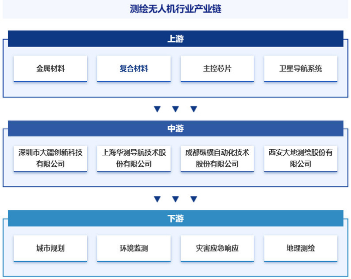 测绘无人机行业产业链是一个涵盖从原材料供应、无人机制造到应用领域等多个环节的完整生态系统。产业链上游主要是原材料供应和关键零部件制造,主要包括金属材料、复合材料、主控芯片、卫星导航系统等。产业链中游为测绘无人机制造。产业链下游为测绘无人机的应用,包括城市规划、环境监测、灾害应急响应、地理测绘等。