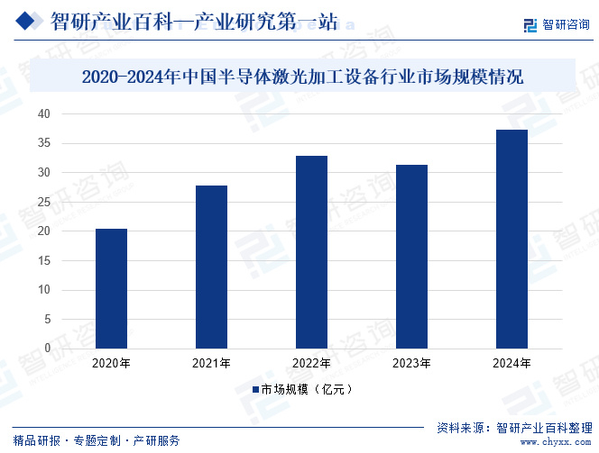 随着半导体终端应用的升级以及对芯片封装性能要求的不断提高,超精密激光加工设备在硅片制造、晶圆制造、先进封装和传统封装等领域的应用需求显著增长。2024年,中国半导体激光加工设备市场规模为37.4亿元,同比增长19.11%。随着半导体终端应用的不断升级,对芯片封装性能的要求也越来越高。超精密激光加工设备在硅片制造、晶圆制造、先进封装和传统封装等领域的应用需求显著增长,推动了市场规模的扩大。