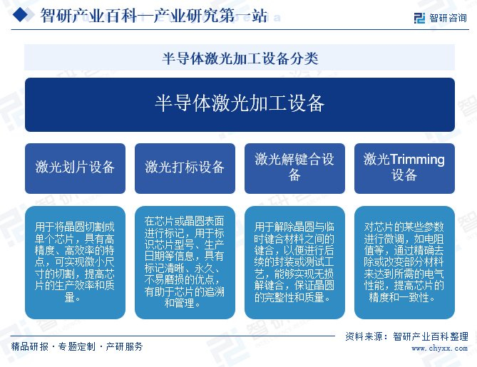 半导体激光加工设备是指在半导体生产环节中通过激光技术对硅片、晶圆及芯片进行加工的工具。其核心是利用半导体激光器产生的高能量激光束,对半导体材料进行精确加工,以实现各种工艺要求。半导体激光加工设备按照不同工艺环节的用途,主要可以分为激光划片设备、激光打标设备、激光解键合设备、激光Trimming设备。