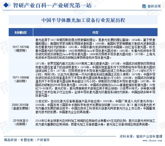 中国半导体激光加工设备行业发展主要经历了四个阶段。1917年至1970年的萌芽期,激光起源于1917年爱因斯坦提出受激辐射理论,是激光发展的理论基础;1954年,基于受激辐射理论,美国科学家汤斯发明微波激射器;1960年,美国科学家梅曼首次制成光波激射器,标志着激光时代的到来;1961年,中国长春光机所研制成功中国第一台红宝石激光器,标志着中国激光时代的到来;1962年同质结GaAs半导体激光器问世;1963年,长春光机所和半导体研究所成功研制出GaAs半导体激光器;1969年双异质半导体激光器问世;1970年,上海光机所和半导体研究所成功研制出单异质结构半导体激光器。