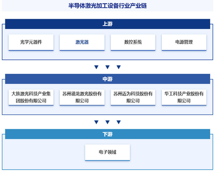 半导体激光加工设备行业产业链上游主要包括光学元器件、激光加工头、激光器、机械部件、数控系统、电源管理以及辅助配件等。这些原材料和部件是制造半导体激光加工设备的基础,其质量和性能直接影响设备的最终性能。产业链中游为半导体激光加工设备的制造环节。产业链下游应用领域主要集中于电子领域。