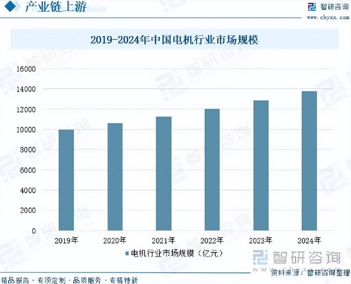 电机是立式吸尘器的核心部件之一,主要作用是产生强有力的负压(吸力),将尘埃污物从地面、墙面等物体表面瞬间吸入立式吸尘器中,并转化为废气排出。作为一种将电能转化为机械能的装置,电机利用电流在电磁场中的相互作用产生旋转或线性运动,从而驱动整机运行。当前,国内电机行业正经历从“量增”到“提质”的关键转型阶段,其应用市场广泛覆盖消费级、车端、工业(如工控)及尖端领域。总体来看,国内企业在消费类、汽车和工业电机等中低端市场已具备较高市场占有率,但在中高端产品方面仍有待突破。据统计,2019-2024年中国电机行业市场规模从9980.72亿元增长至13738.64亿元,年复合增长率为6.6%。未来,随着电机行业整体规模的持续扩大与技术升级,将进一步带动立式吸尘器等下游应用领域的发展与创新。