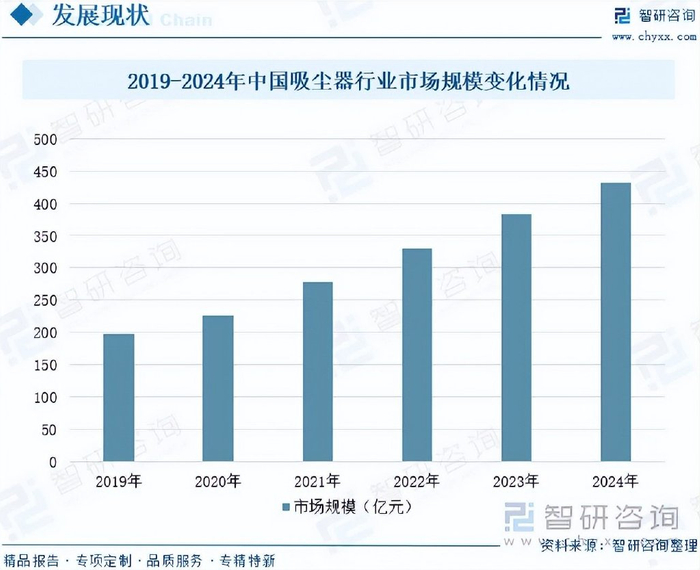 吸尘器是一种利用电动机驱动叶片高速旋转,在密闭壳体内形成空气负压,从而通过吸尘管吸取尘屑的清洁电器。它能够有效清除地面、地毯和家具表面的灰尘、碎屑及毛发等杂物,并收集于集尘装置内,以达到净化环境的目的,已成为现代家庭与商业场所中不可或缺的清洁工具。近年来,我国吸尘器市场规模持续扩大,在居民生活水平提升、消费观念转变及家居环境改善需求增强的推动下,吸尘器作为高效清洁电器日益获得广泛应用。数据显示,中国吸尘器行业市场规模从2019年的198亿元增长至2024年的432亿元,年均复合增长率达16.89%。展望未来,随着我国城市化进程不断推进、居民住房面积进一步增加,以及大众对家居清洁重视程度的持续提高,吸尘器市场的需求预计将保持稳定增长态势。