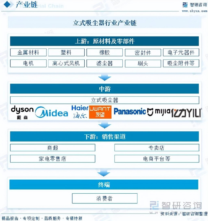 立式吸尘器产业链上游为原材料和零部件,主要包括金属材料、塑料、橡胶、密封件、电子元器件、电机、离心式风机、滤尘器、刷头、吸尘附件等。产业链中游为立式吸尘器的生产制造环节。产业链下游为销售渠道,主要包括商超、专卖店、家电零售店、电商平台等。终端为消费者,购买立式吸尘器主要用于地毯、车内的清洁、电器、家居等领域。