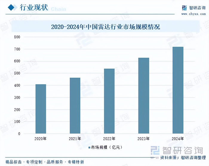 在十四五规划攻坚期,国防信息化投入持续加大,相控阵雷达、反隐身雷达等高端装备列装加速。同时,民用雷达如车载毫米波雷达、气象雷达、空管雷达、安防监视雷达、无人机探测雷达等受益于工业制造快速发展而发展。2024年,中国雷达行业市场规模约为719.66亿元,同比增长14.58%。微波管在雷达中承担信号发射与接收功能,直接影响探测距离、精度及抗干扰能力。