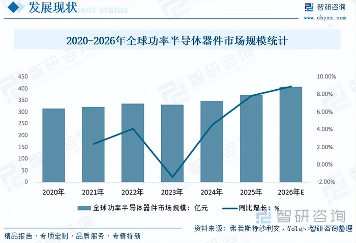 功率器件作为能源转换系统的核心部件被广泛应用于各类电子设备中。近年来,随着消费电子需求的重新恢复增长,汽车电子、可穿戴设备、物联网、人工智能等新兴应用领域需求的推动,全球功率半导体器件市场市场保持增长态势。2025年全球功率半导体器件市场规模增长至374.5亿元,预计2026年有望达到407.8亿元。