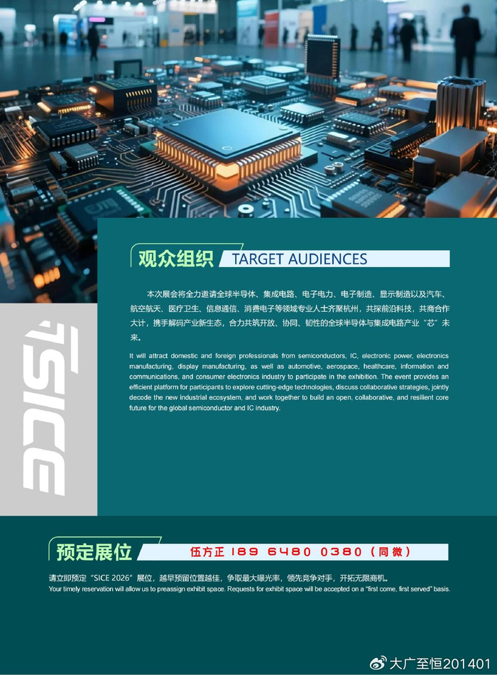 为给更多的半导体与集成电路企业搭建一个集产品展示、贸易洽谈、技术交流、投资合作于一体的国际化平台。在上级主管部门的指导下,高登会展联合相关主管单位将于2026年05月14日-16日在杭州大会展中心召开“2026杭州国际半导体与集成电路产业创新展览会”,展会以“链接芯生态,智造新机遇”为主题,展会总规划面积为3万平米,展品范围涵盖关键设备及零部件、半导体材料、EDA&IP、集成电路设计、制造、封装测试、半导体服务、芯片应用等产品和技术。本届展会将汇聚全球半导体与集成电路行业尖端技术、前沿产品,从芯片设计到集成电路解决方案,全方位展示半导体与集成电路产业的创新力量。通过展览与论坛相结合形式,从不同视角全方位展示中国(尤其是长三角地区)半导体与集成电路产业的创新实力与发展成果、分享产业前沿动态、汇聚产业创新人才、