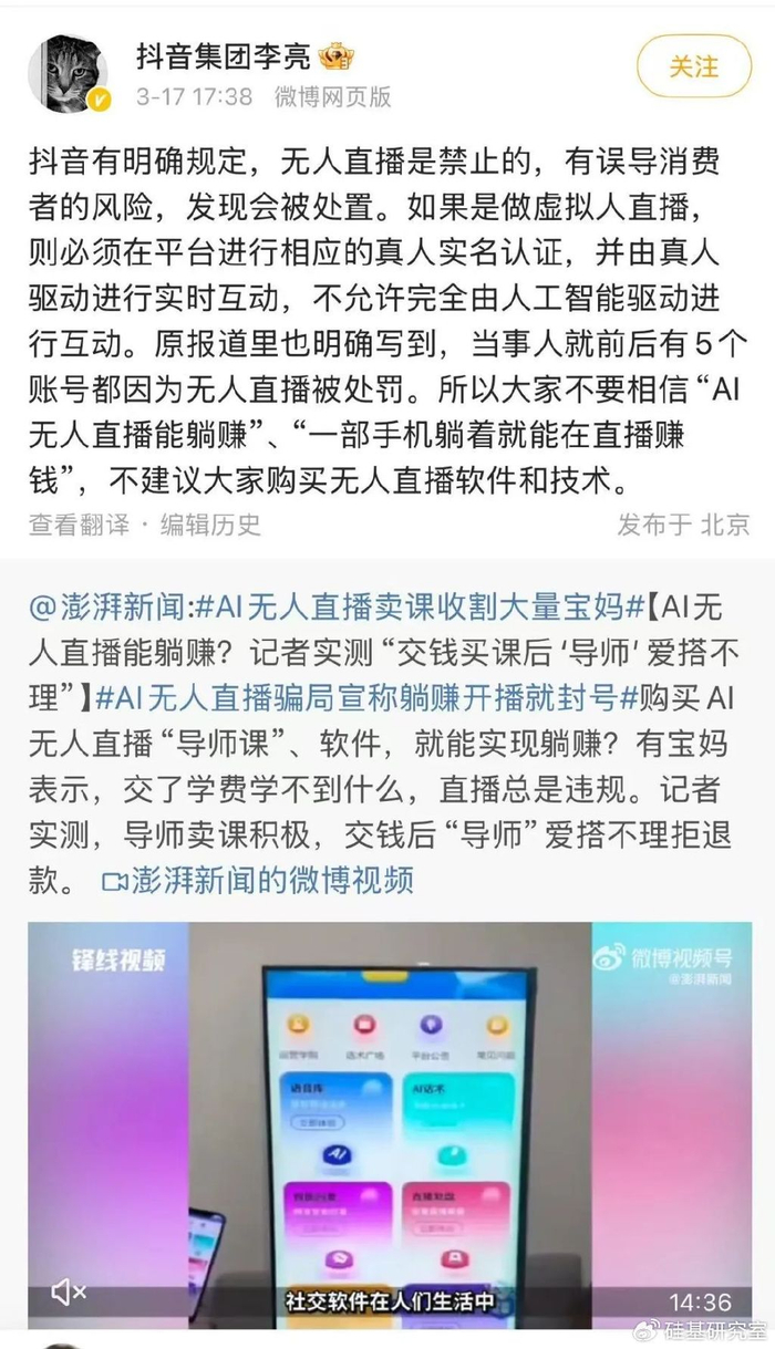 •二是矩阵直播,作为闲时补充。此类数字人直播和真人主播协同,满足用户全时段购物需求。