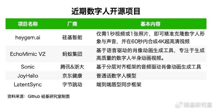 比如硅基智能在近期开源数字人模型 heygem.ai,阿里达摩院推出的 EchoMimic V2,专注在数字人半身动画视频生成;腾讯与浙大联合开源的 Sonic ,京东开源的普通话数字人项目JoyHallo、字节跳动推出的端到端唇形同步框架Latentsync等等,都在加速数字人技术的普及。