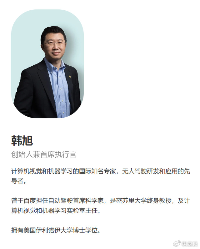 文远知行和萝卜快跑都是做自动驾驶的,文远知行的创始人韩旭以前还是百度自动驾驶事业部的首席科学家。2017年,韩旭离开百度创立文远知行(最初叫景驰科技),和老东家正式成为对手。