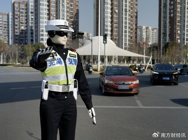 奇瑞墨甲机器人"芜优"智警 R001胸前佩戴"芜湖"标识与"智警 R001"警号,身姿挺拔,立于路中安全岛,机械臂指挥动作流畅标准,与现场交警协同配合,有序进行交通指挥与劝导。其充满未来感的造型与精准的"执法"姿态,吸引不少市民放缓脚步拍照记录。"这是我们第一次与机器人并肩执勤,它更像一名可靠的交警助手。"现场执勤交警表示。