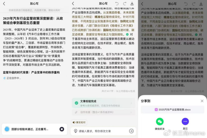 我也试用了一下,拿“最近汽车行业监管政策解读”这个问题生成了一篇文章,具体细节和最终成果我就不展开说了,只说结论:质量很可用,以对话助手的方式,达到了我以前用某些大模型的智能体的水平。