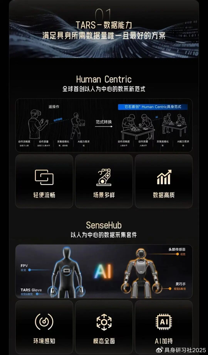 基于此,它石参考了自动驾驶和大语言模型在数据侧的破局方法。自动驾驶的数据来源依赖海量人类真实的驾驶行为;大语言模型取之不尽的互联网数据也依赖人类的贡献。那具身智能的数据也应该是从人类生活的万千环境里,真实交互行为中沉淀的数据资产。