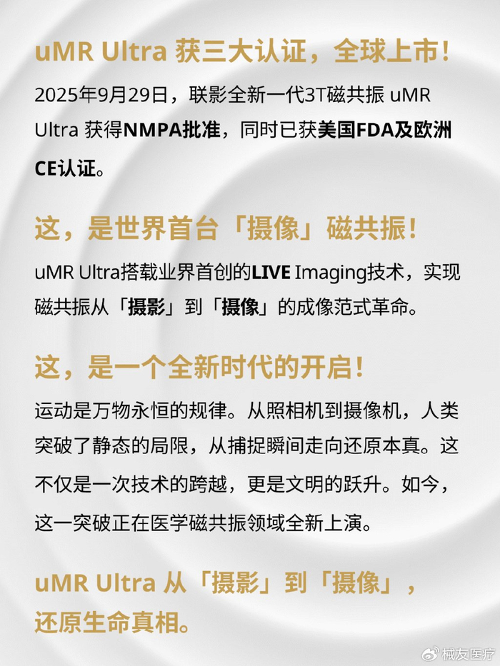 2025年9月29日,中国医疗科技迎来一个里程碑时刻:联影医疗自主研发的世界首台“摄像”磁共振uMR Ultra正式获得国家药监局批准上市。这款设备的神奇之处在于,它能让医生像看视频一样观察人体内部的活动状态,彻底解决了困扰磁共振领域数十年的“运动伪影”难题。