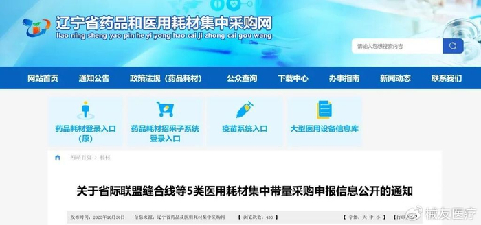 10月30日,辽宁省药品及医用耗材集中采购网发布省际联盟缝合线集采申报信息,覆盖24省,协议采购量达6068.80万根。